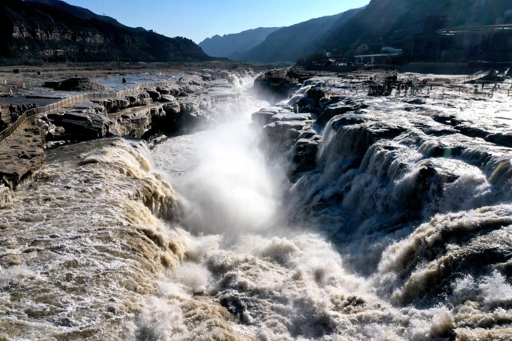 壺口瀑布是黃河流域的一大奇觀。據當地水文部門介紹,黃河壺口段目前正處于枯水期,水流量約為500立方米/秒。受冷空氣影響,12月14日8時,黃河壺口段首次出現流凌,較去年偏晚11天。該河段流凌部分由上游河道輸送而來,部分由該河段本身產生,通常只流凌不封凍,一般于每年的11月下旬或12月初出現流凌,次年2月中下旬消失。