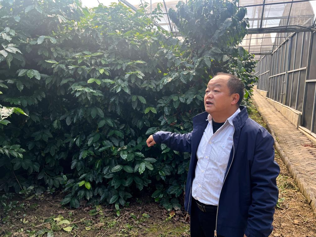 在研究所資源圃,胡發廣向記者介紹咖啡品種選育情況。新華社記者溫競華 攝