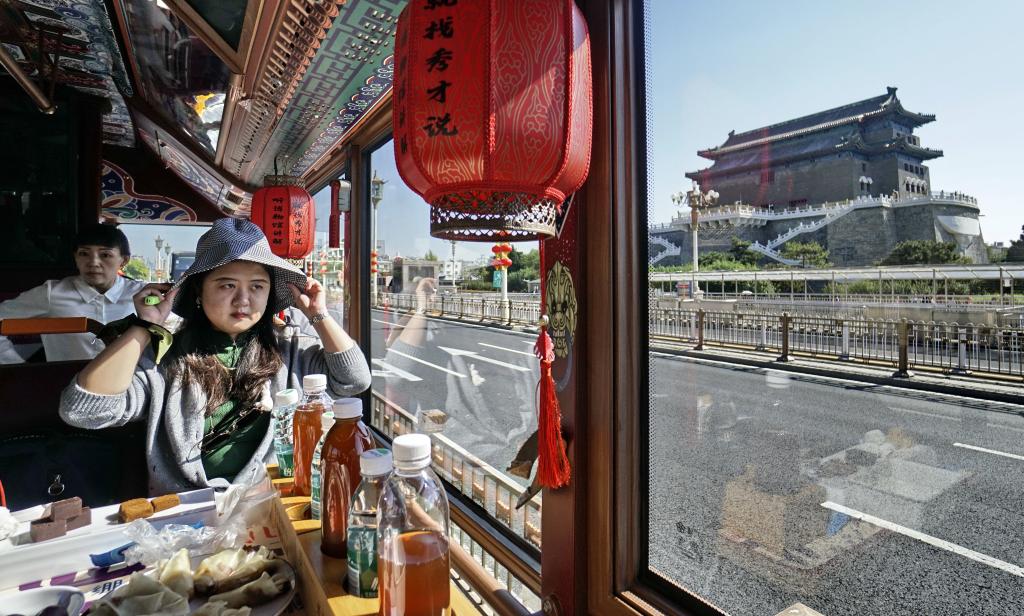 中軸線上的“鐺鐺車”途經前門城樓。新華社記者 李欣 攝