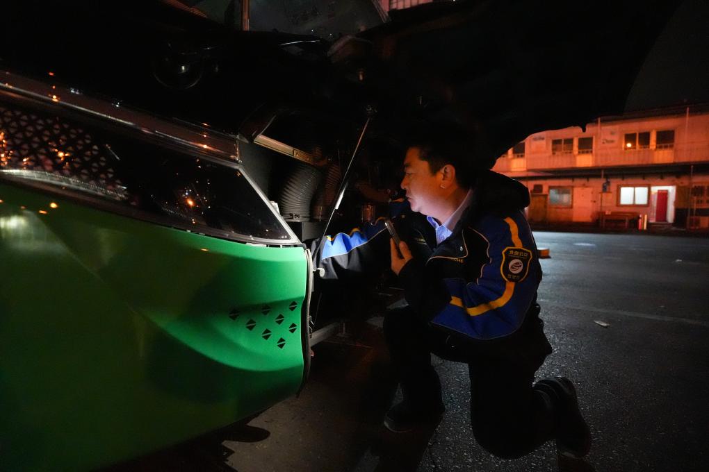 12月16日,北京市朝陽區東大橋公交場站,果長義在檢查車況。新華社記者 鞠煥宗 攝