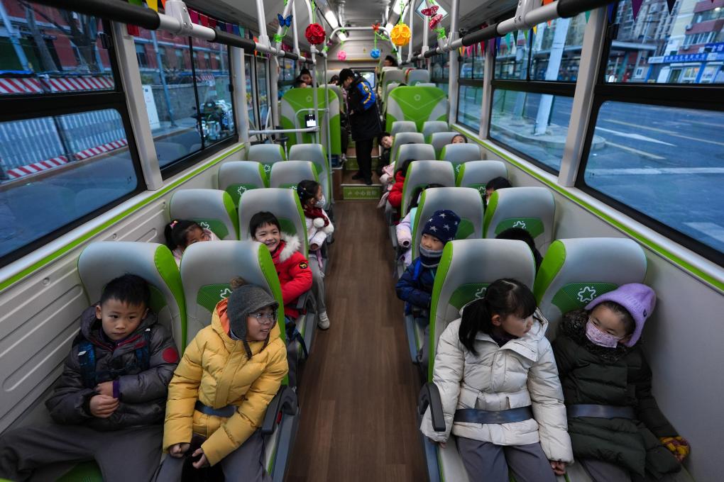 12月16日,學生們乘坐通學車前往呼家樓中心小學。新華社記者 鞠煥宗 攝