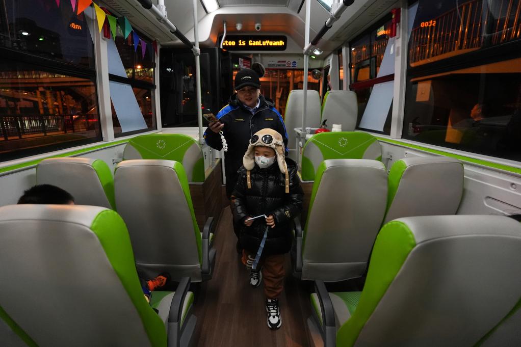 12月16日,北京市朝陽區太平莊公交站,乘務員徐潔(后)引導小朋友上車就座。新華社記者 鞠煥宗 攝