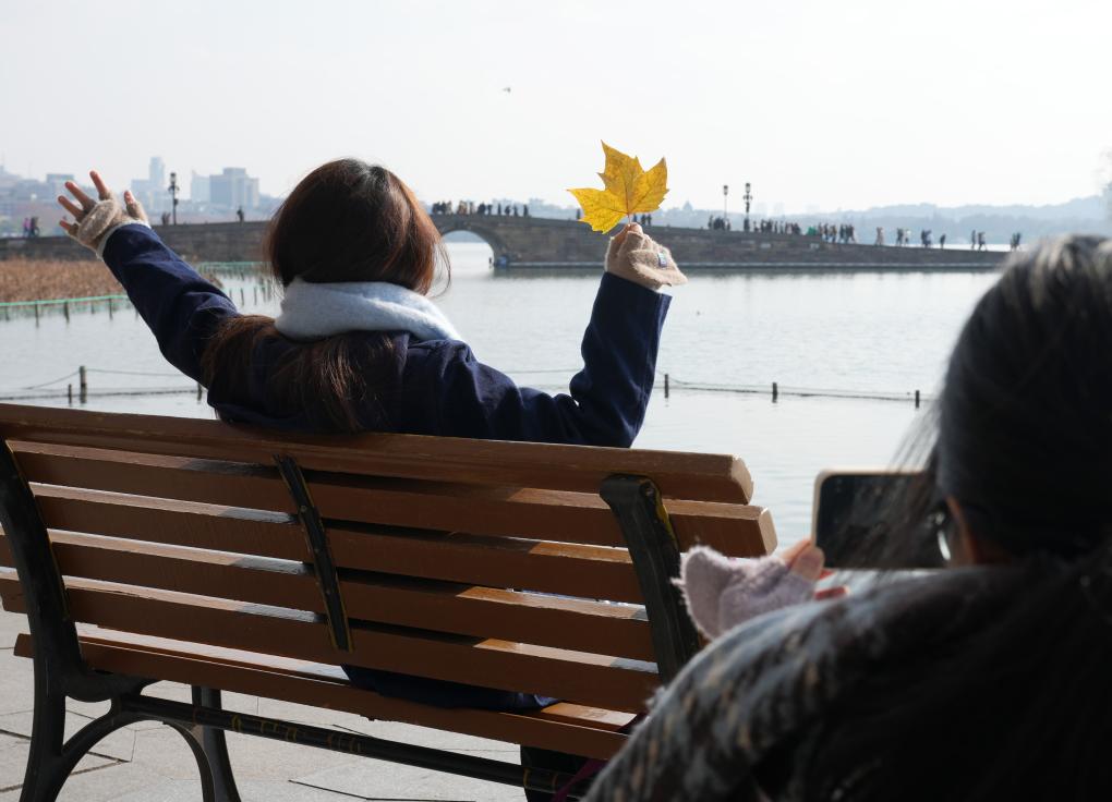 12月19日,杭州西湖斷橋對面的北山街,一名游客拿著落葉拍照。新華社記者 韓傳號 攝