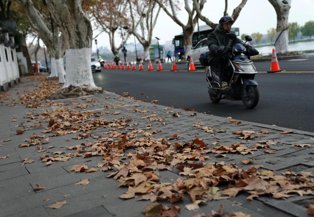 12月19日晨,杭州西湖邊的北山街,車輛和行人從落葉邊經過。新華社記者 韓傳號 攝