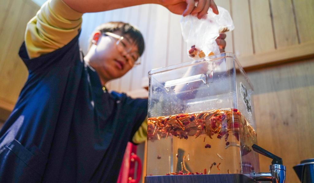 北大湖滑雪度假區中醫康養館工作人員煮制人參代茶飲。新華社記者 王帆 攝