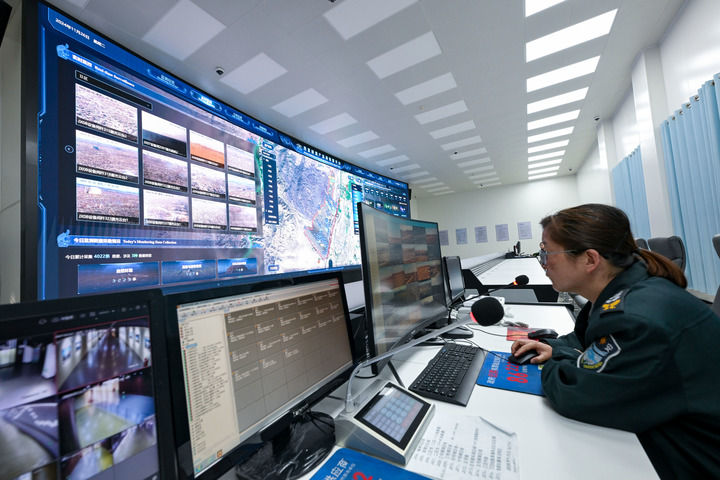 2024年11月26日,西夏陵博物館工作人員通過遺址動態信息及監測預警系統查看陵區情況。新華社記者 馮開華 攝