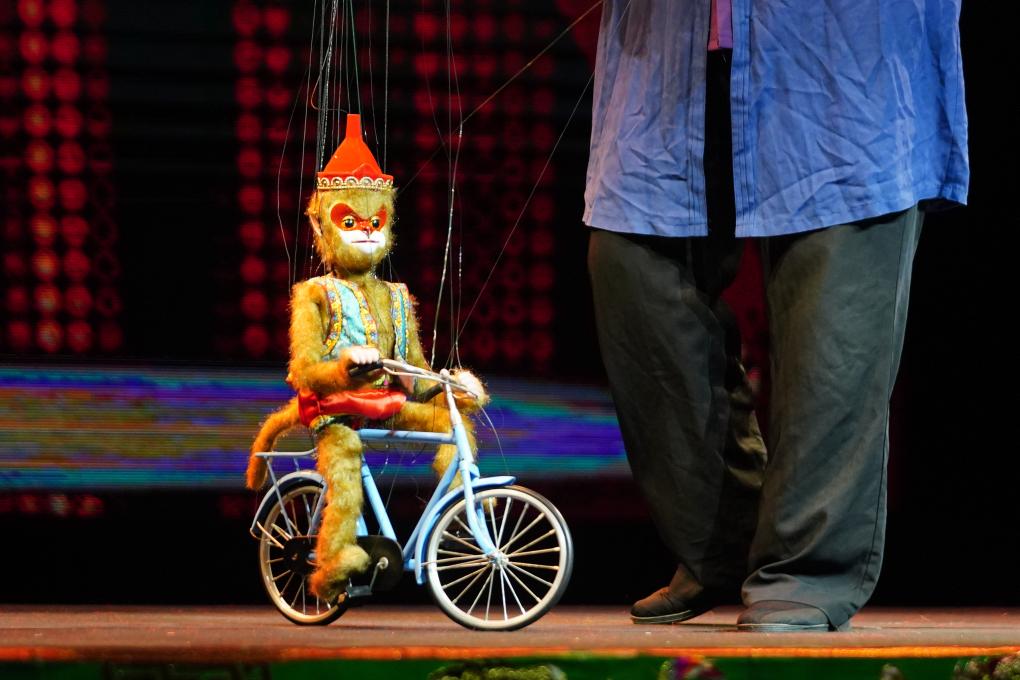 在數十根絲線的操控下,木偶鐘馗拎起酒壺,將酒灌入嘴中,打了個嗝后,又捧起酒壇一口氣喝光。木偶小猴憨態可掬,伴著音樂聲彈起吉他?!巴ㄟ^細線就能讓木偶抓穩酒壺、彈起吉他、甚至能騎車,太精妙了!”觀眾們驚嘆不已。