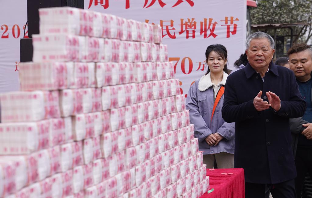 1月8日,在江西南昌安義縣鼎湖鎮的一個小院里,1486萬元現金堆成小山。數百位農民在臺下翹首以盼,期待叫到自己的名字領取“年終獎”。