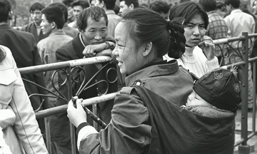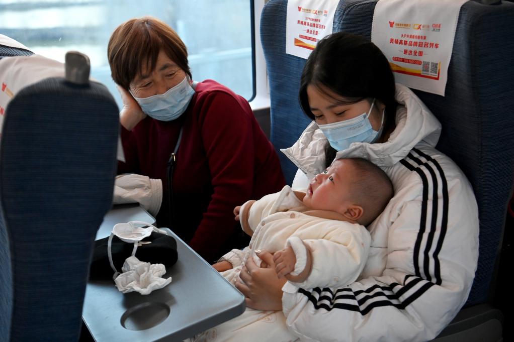 1月14日,一位乘客在G2025次列車上與寶寶互動。新華社記者鄒競一 攝