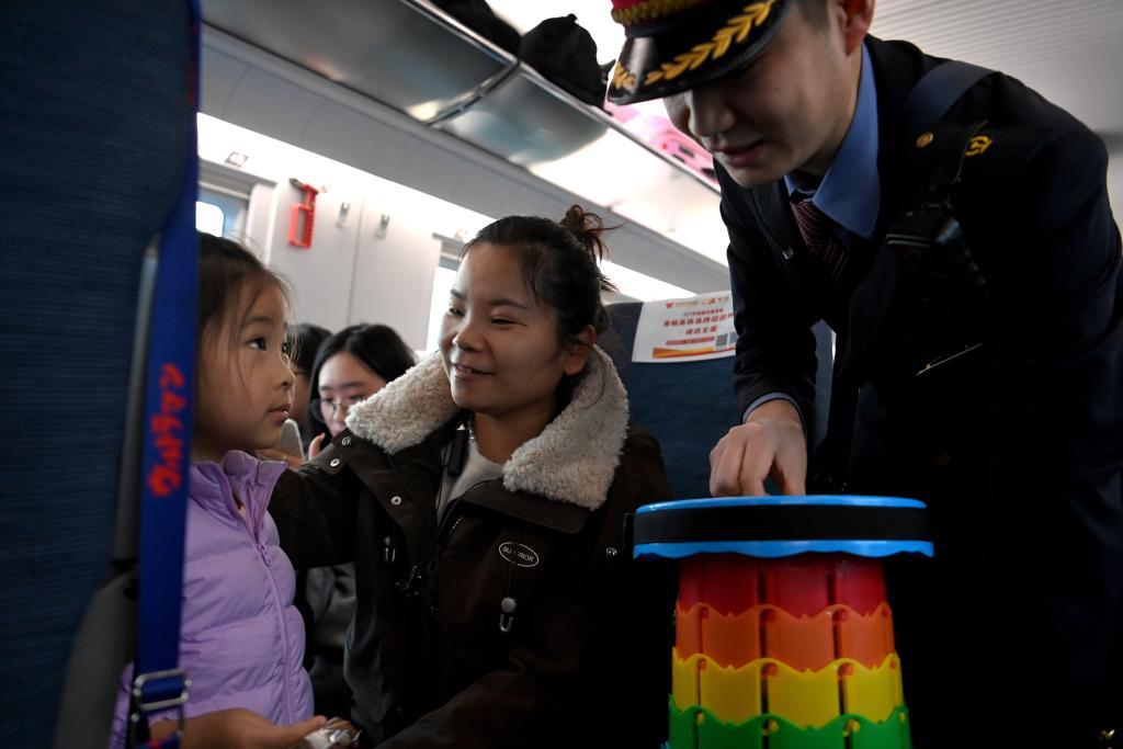 1月14日,G2025次列車乘務員為乘客提供兒童便民凳。新華社記者鄒競一 攝