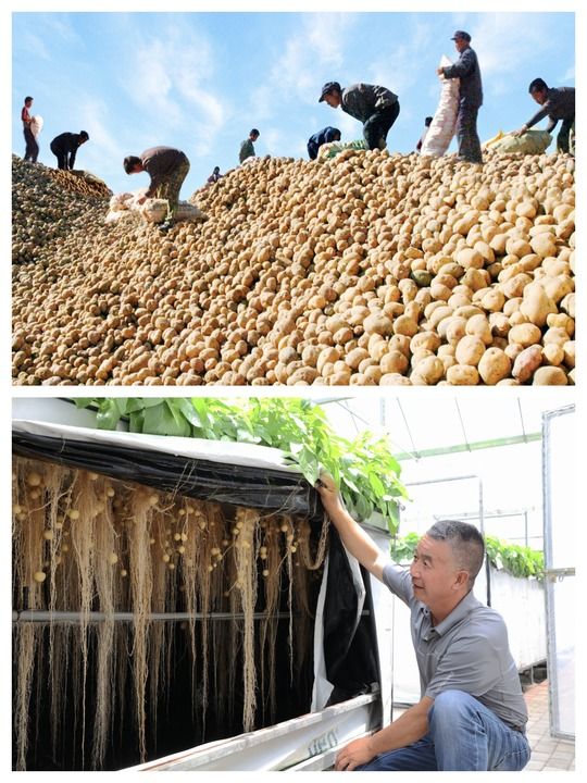 拼版照片:上圖為上世紀90年代定西市安定區馬鈴薯豐收的場景,下圖為定西馬鈴薯研究所繁育的馬鈴薯種薯。(定西市委宣傳部供圖)