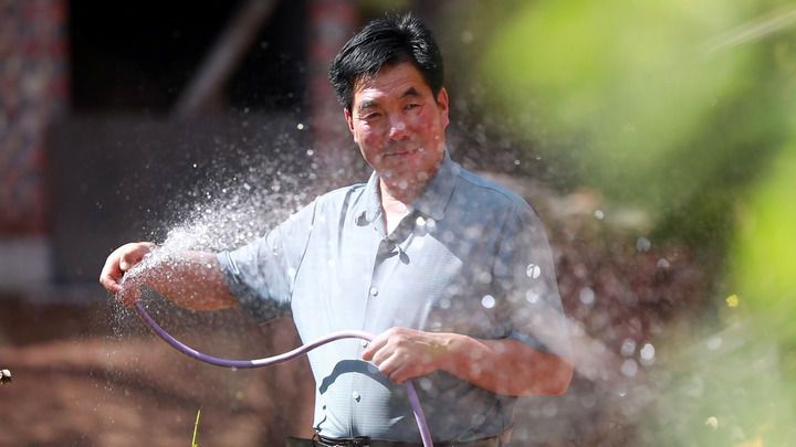 定西市渭源縣上灣鎮常坪村村民胡建斌在家門口用自來水澆花。新華每日電訊記者郭剛攝