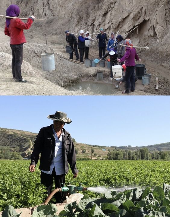 拼版照片:上圖為上世紀90年代拍攝的定西市通渭縣山區群眾在山泉前排隊取水飲用。下圖為2022年8月定西市安定區引洮供水工程受益區村民進行菜地灌水。(定西市委宣傳部供圖)