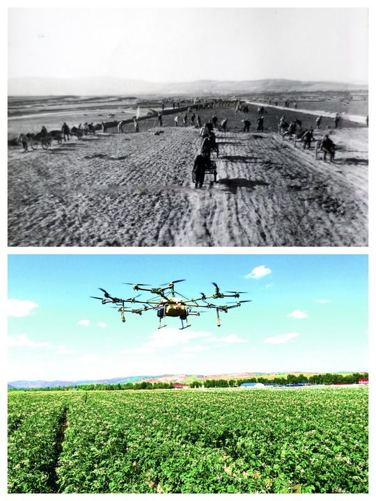 拼版照片:上圖為上世紀90年代定西市安定區群眾種植馬鈴薯場景。下圖為2024年定西市安定區香泉鎮馬鈴薯種植基地進行無人機田間管理作業。(定西市委宣傳部供圖)