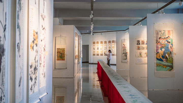 游客在定西市通渭縣悅心國際書畫村觀賞書畫作品。
