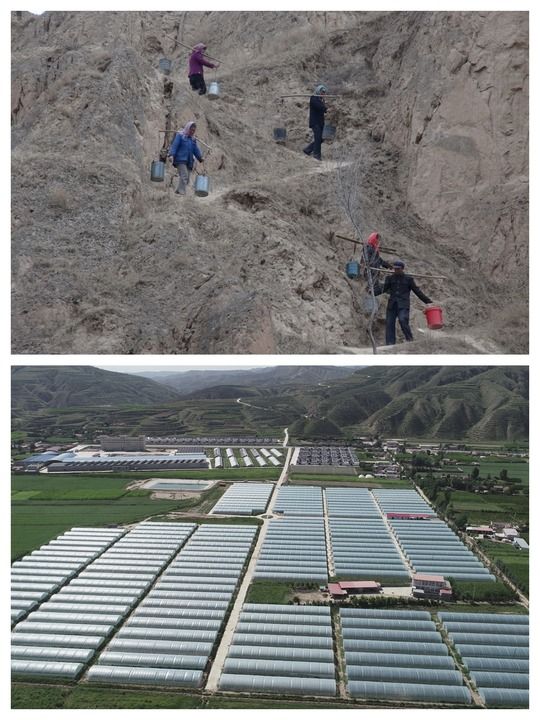 拼版照片:上圖為上世紀90年代定西市安定區山區群眾挑水的場景,下圖為引洮工程通水后有了水源保障的蔬菜大棚。(定西市委宣傳部供圖)