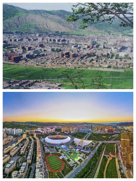 拼版照片:上圖為20世紀90年代的定西,下圖為現在的定西。(定西市委宣傳部供圖)