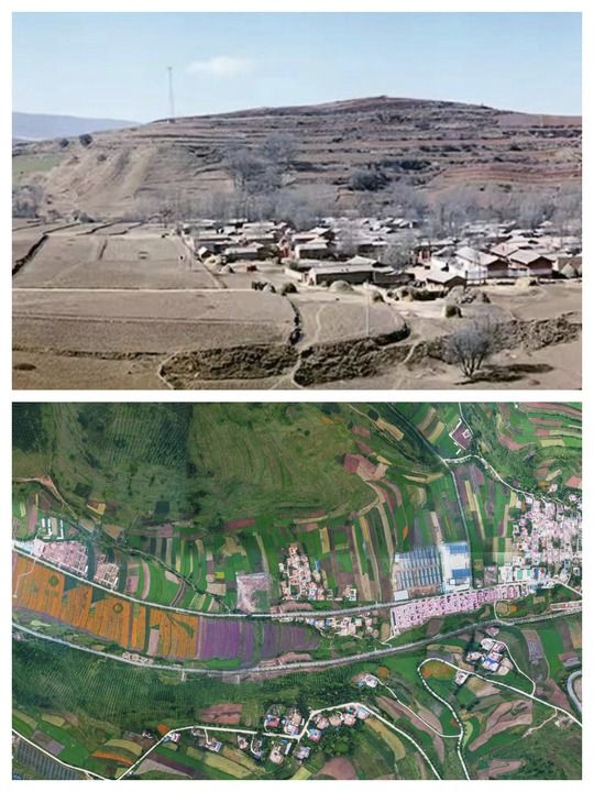 拼版照片:上圖為2013年拍攝的定西市渭源縣元古堆村舊貌。下圖為2022年拍攝的定西市渭源縣元古堆村新貌。(定西市委宣傳部供圖)