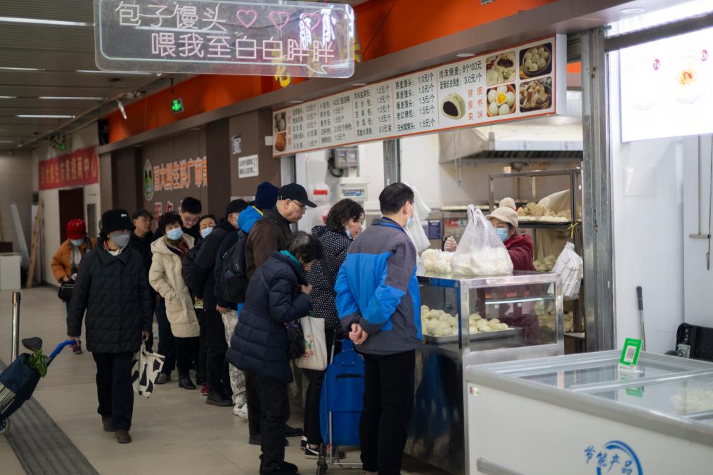 市民們在菜市場里的老食饃攤位前排隊。新華社記者 伍志尊 攝