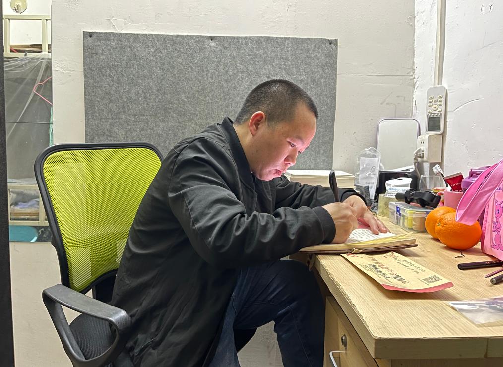 楊秀祥在出租屋內登記助學情況。 新華社記者 駱飛 攝