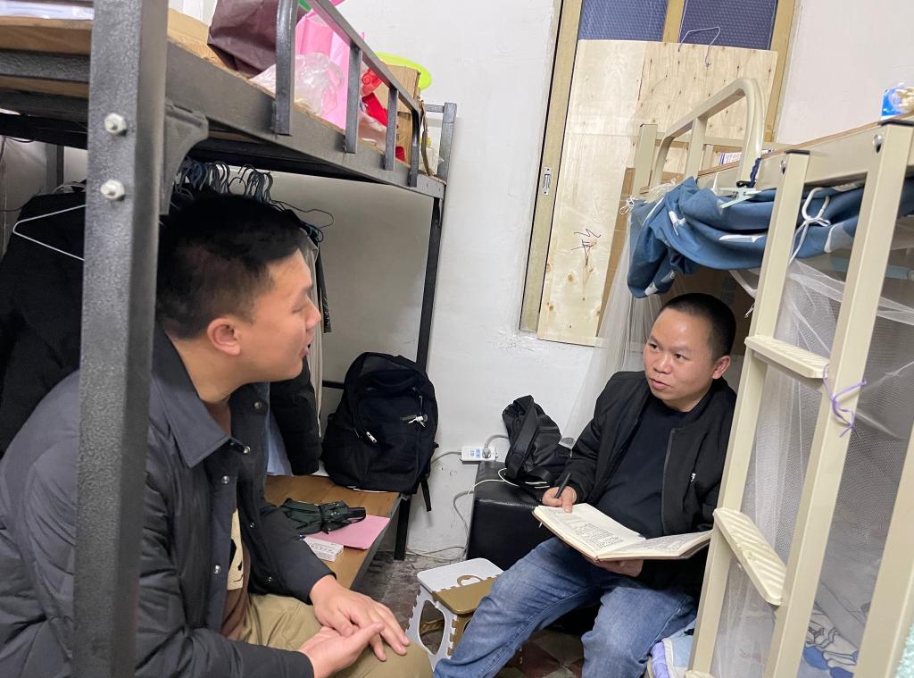楊秀祥(右)在出租屋內給記者介紹助學情況。新華社發