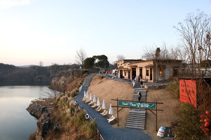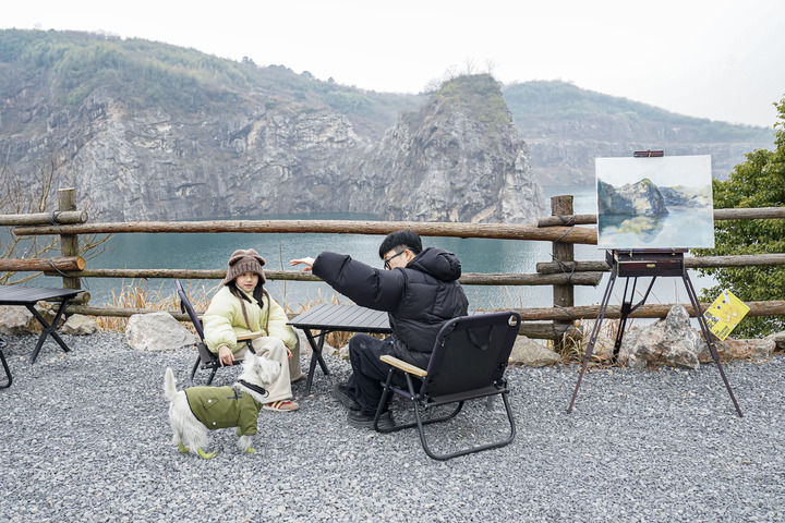 游客在安吉梅溪鎮紅廟村“深藍計劃”咖啡館的礦坑邊休閑賞景(2025年1月24日攝)。新華社發(潘學康攝)