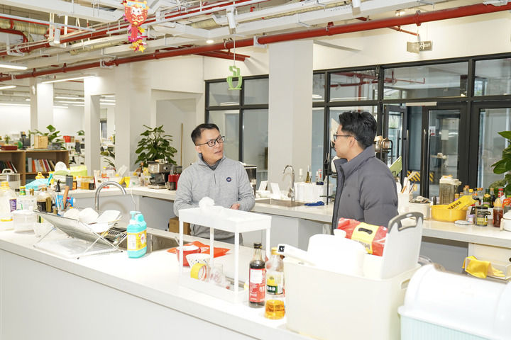 安吉數字游民公社管理員夏雨(左)與在這里工作生活的數字游民交流(2025年1月24日攝)。新華社發(潘學康攝)