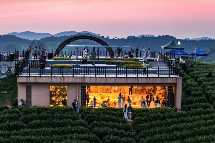 安吉溪龍鄉白茶原觀景平臺及網紅咖啡店的游客絡繹不絕(2024年5月2日攝,無人機照片)。新華社發(潘學康攝)