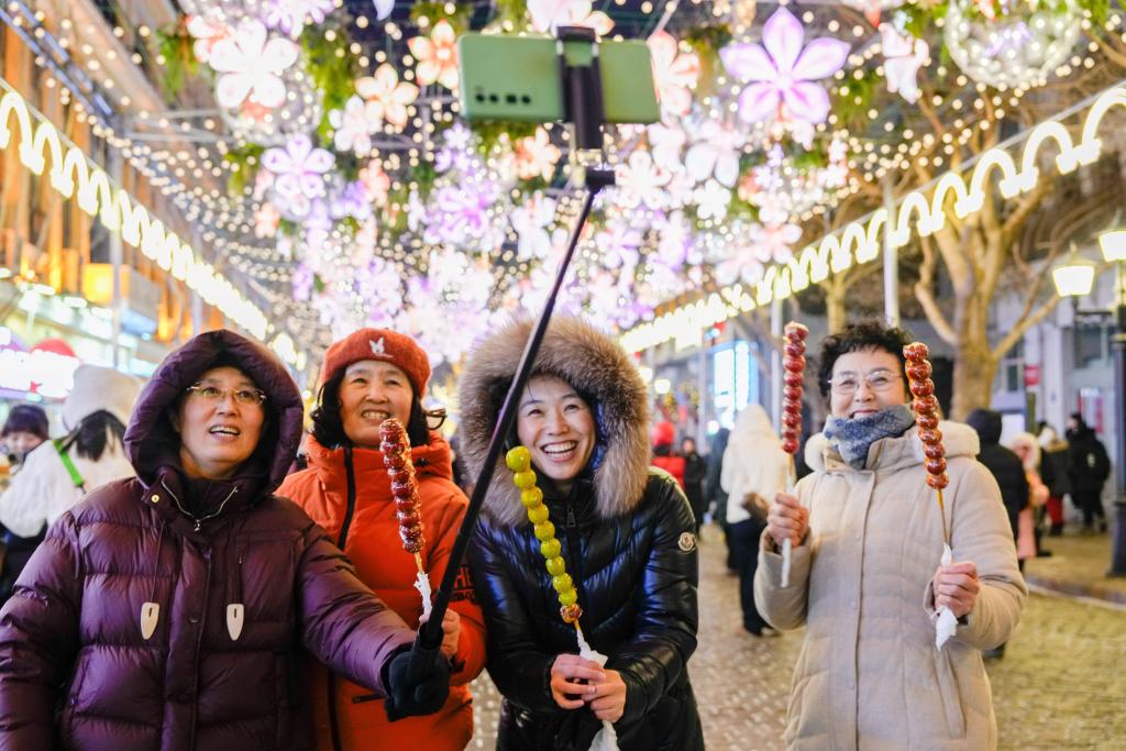 游客在哈爾濱中央大街上手持冰糖葫蘆自拍。新華社記者 王建威 攝