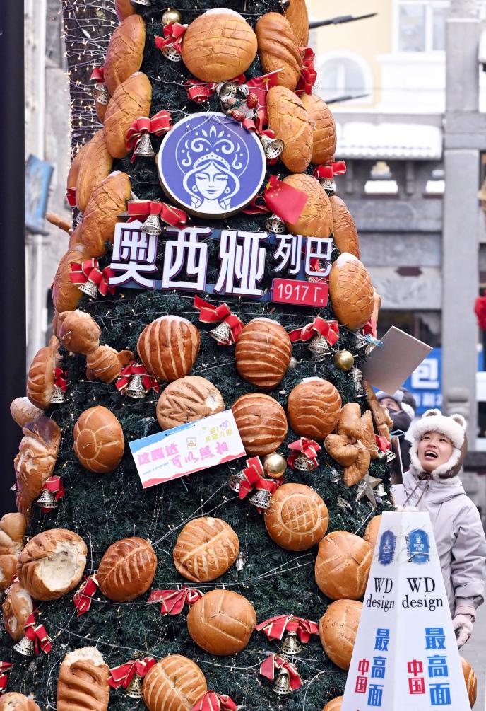 在哈爾濱市中華巴洛克歷史文化街區,一個女孩觀看“面包圣誕樹”。新華社發(劉洋 攝)