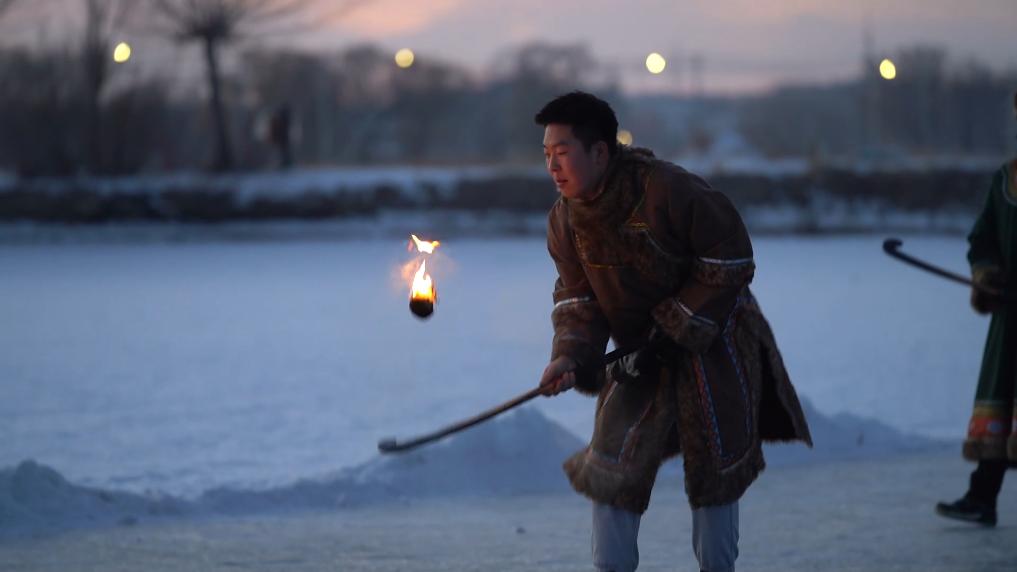 隨著參與者將火球點燃,揮桿將火球挑起、拋擲,熾熱的火球在冰面上飛馳,在空中起舞,劃出一道道火光,宛如一條火龍奔騰穿梭。一場充滿力量與激情的達斡爾族火球賽精彩上演。