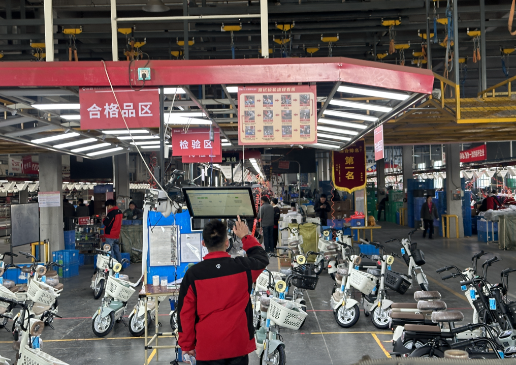 臺鈴電動科技(天津)有限公司車間內,工人正在檢查車輛生產情況。新華社記者 王暉 攝