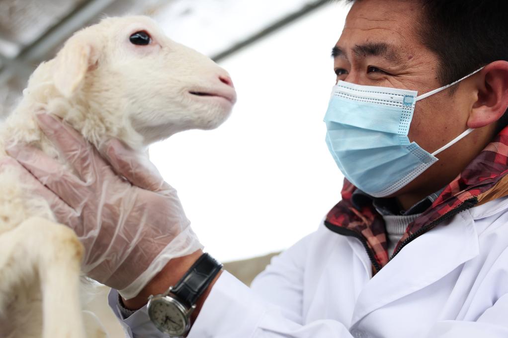 在東鄉族自治縣伊菲種植養殖農民專業合作社的養殖場,張忠山查看羊羔生長情況。新華社記者 陳斌 攝