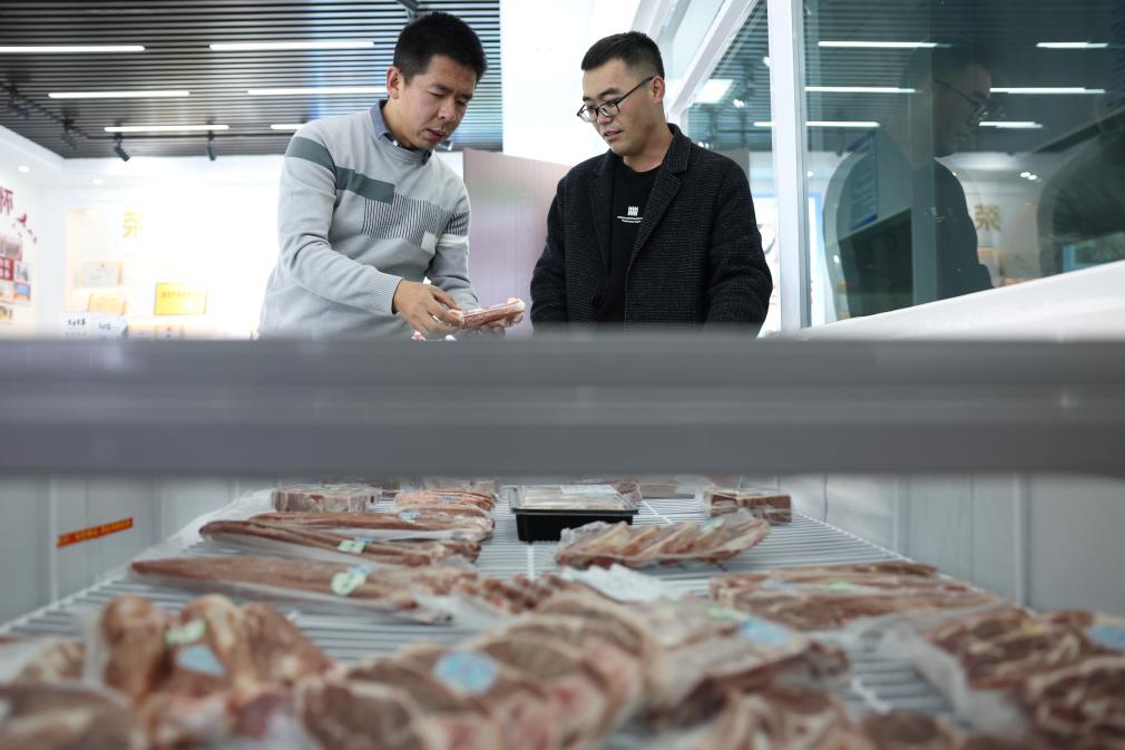 在東鄉族自治縣伊菲種植養殖農民專業合作社,張忠山(左)和同事一起整理冰柜內擺放的羊肉樣品。新華社記者 陳斌 攝
