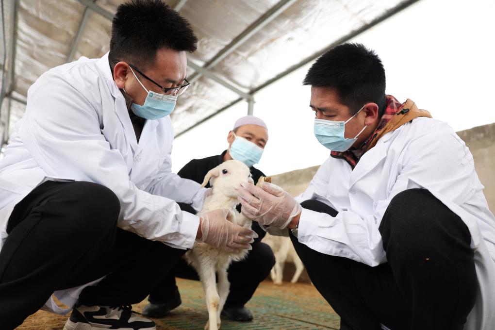 在東鄉族自治縣伊菲種植養殖農民專業合作社的養殖場,張忠山(右一)查看羊羔生長情況。新華社記者 陳斌 攝