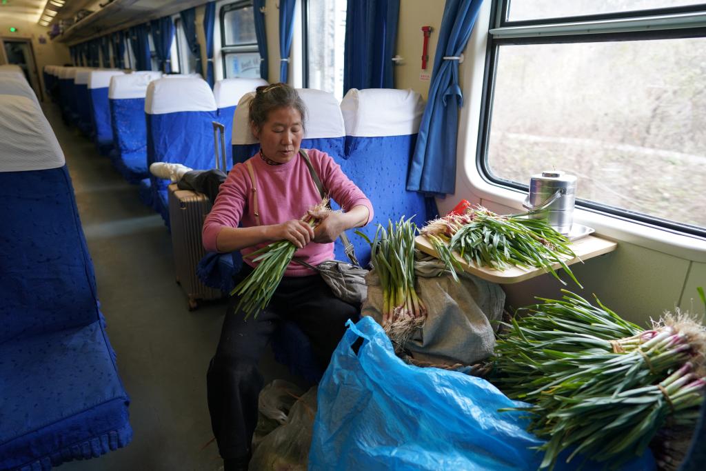 56歲的雷翠蘭家住燕子砭鎮,是這趟慢火車的“??汀?。提著小蔥、蒜苗和芹菜的她一上車就往4號車廂走去,開始整理自己要賣的蔬菜。