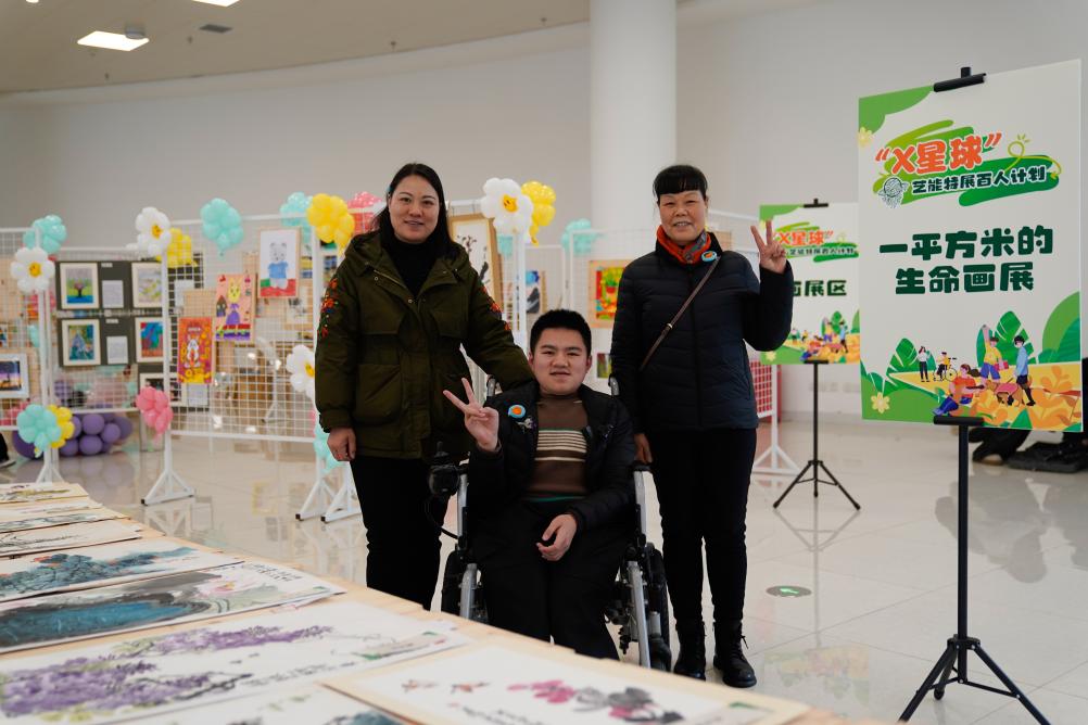 3月17日,胡星(中)和媽媽稅瑞(左)、外婆羅太回在畫展現場合影。