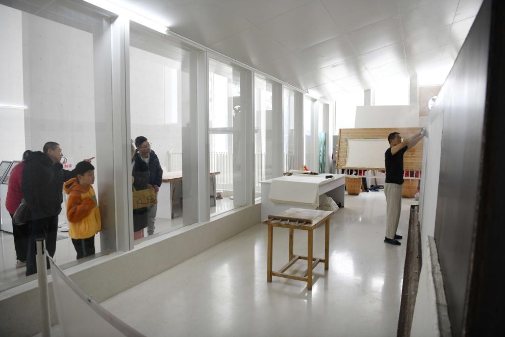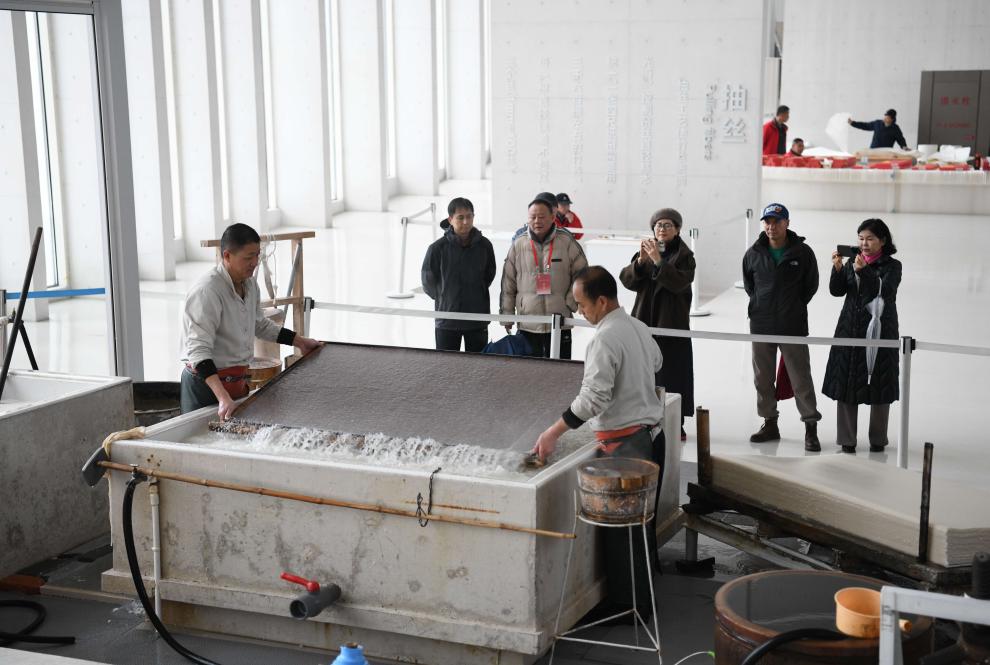 3月15日,游客在位于涇縣中國宣紙小鎮的宣紙文化園內觀看宣紙撈紙工藝展示。新華社記者 劉軍喜 攝