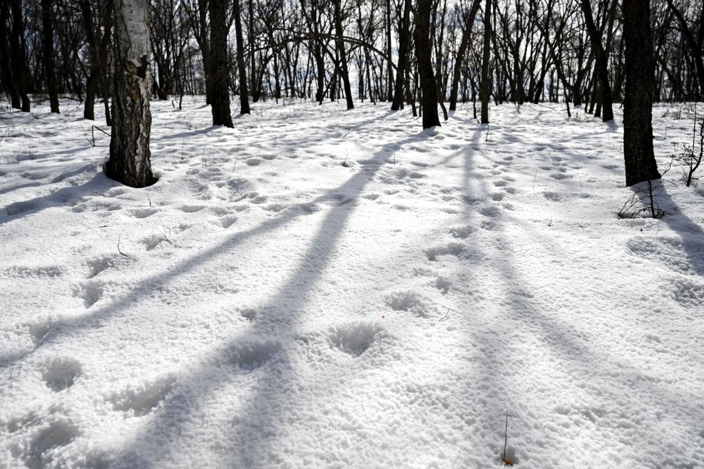 在內蒙古額爾古納國家級自然保護區生態廊道內,野生動物在積雪上留下的足跡(3月25日攝)。新華社記者連振 攝