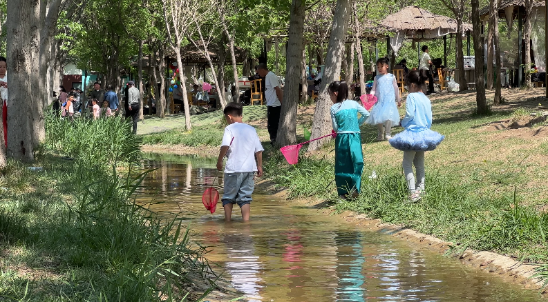 “墅外桃源”生態觀光園內,孩童正在體驗捕撈樂趣。新華社發