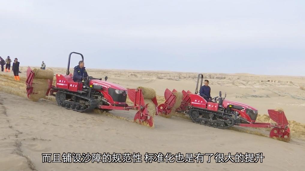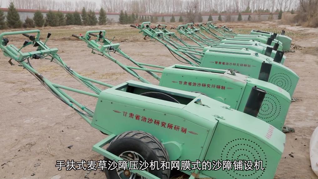 在甘肅“三北”工程河西走廊-塔克拉瑪干沙漠邊緣阻擊戰中,由甘肅省治沙研究所自主研發的網膜沙障鋪設機、手扶式麥草沙障壓沙機等各種“新式武器”也大顯身手,有效提高防沙治沙的工作效率和質量。