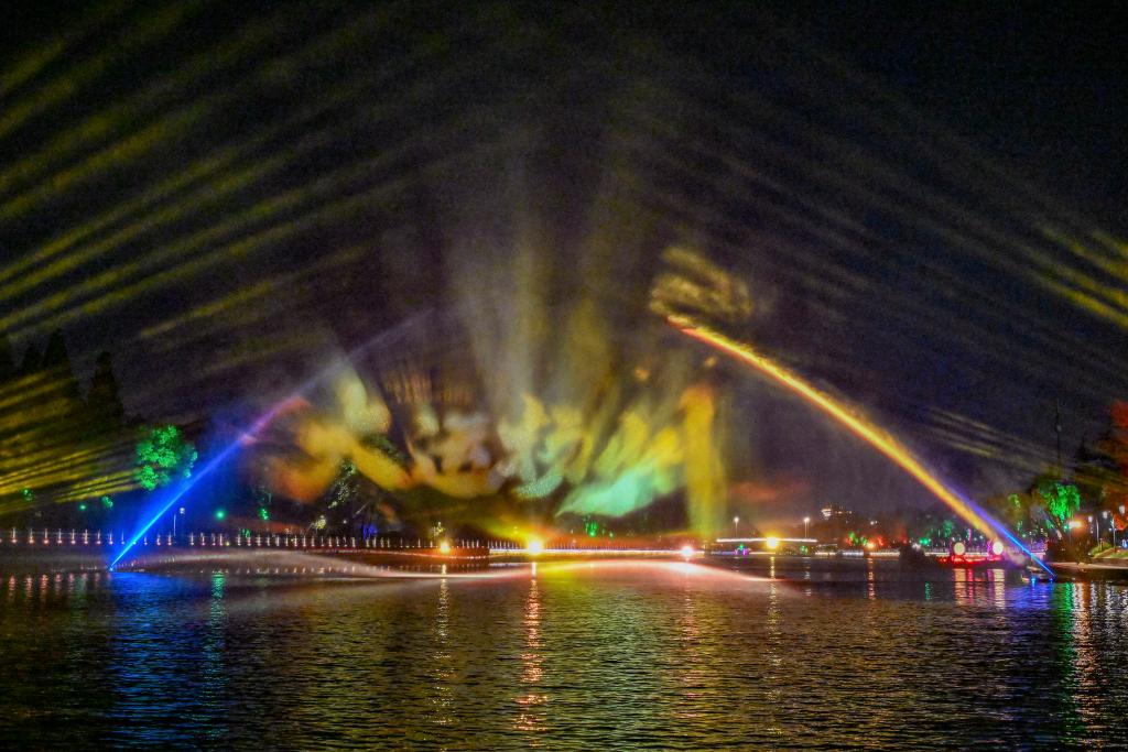 這是江蘇揚州“大運揚州”古運河行進式游船演繹體驗項目燈光秀(2025年5月19日攝)。新華社記者 陳朔 攝