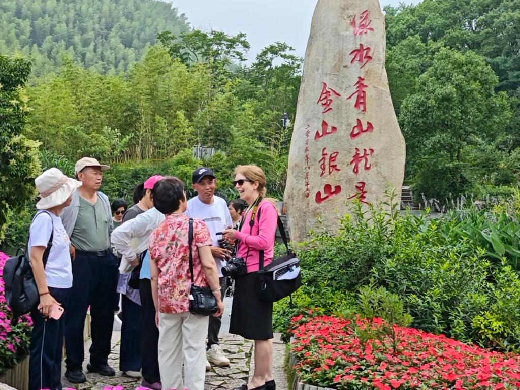 在浙江省安吉縣天荒坪鎮余村,外媒記者采訪游客。新華社記者 唐詩凝 攝