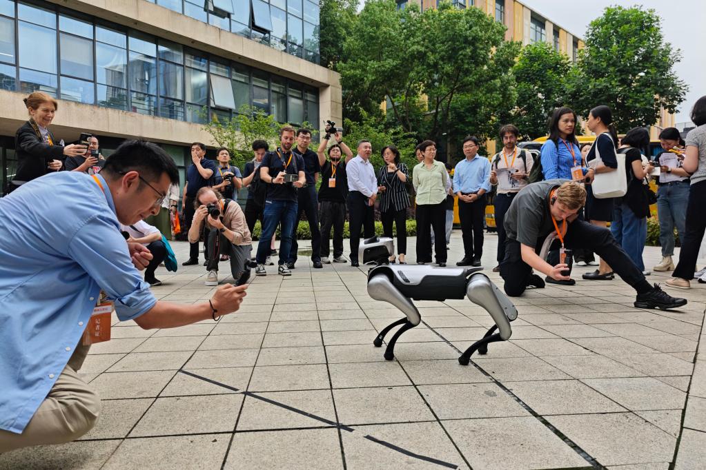在魔法原子機器人科技(蘇州)有限公司,中外媒體記者拍攝四足機器人。新華社記者 唐詩凝 攝