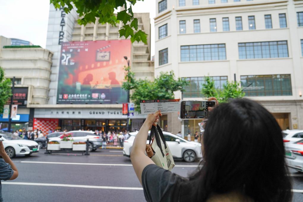 同日的南京西路,大光明電影院前,不少觀眾拿著票根與今年上海國際電影節的海報合影。來自杭州的小劉當天一早出發,只為赴一場與“電影之城”的約定?!敖裉煸诖蠊饷麟娪霸嚎戳恕短煅臏S落女》和《春潮》兩部電影,行前特地做了功課,看完后感覺不虛此行,我很喜歡上海這座城市和電影擦出的別樣火花?!?/p>