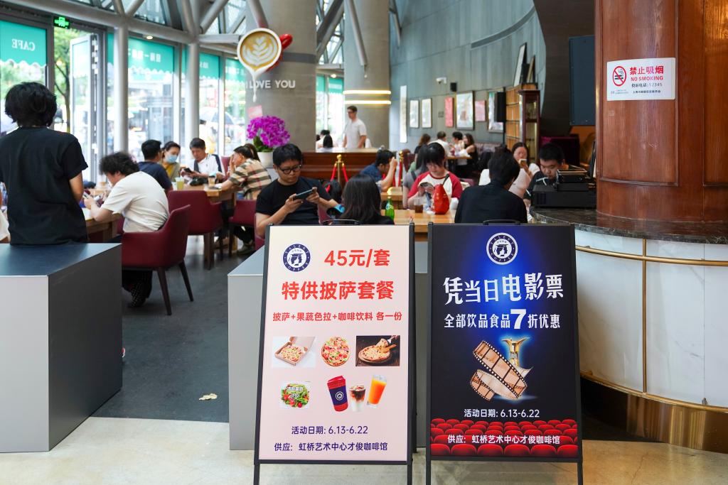 6月15日,位于虹橋藝術中心的天山電影院人頭攢動。在影院客流帶動下,一樓咖啡館的顧客也是絡繹不絕?!拔覀冊陔娪肮澠陂g推出特供披薩套餐,憑當日電影票根可以享受全場飲品7折的優惠,飲品的銷量也比平時大幅增加?!辈蛷d服務員介紹。