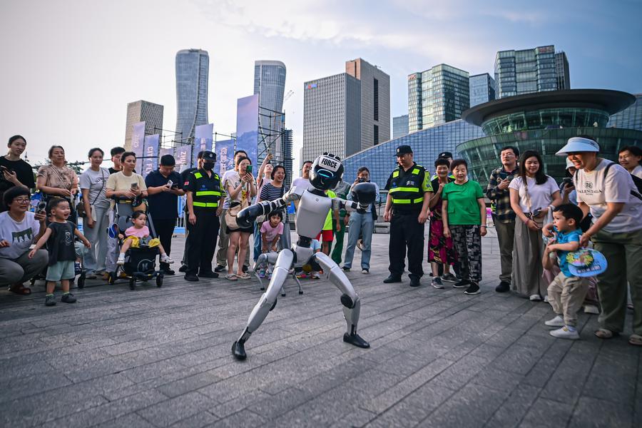 6月27日,市民在2025杭州奇妙夜活動主會場觀看人形機器人表演。新華社記者 江漢 攝