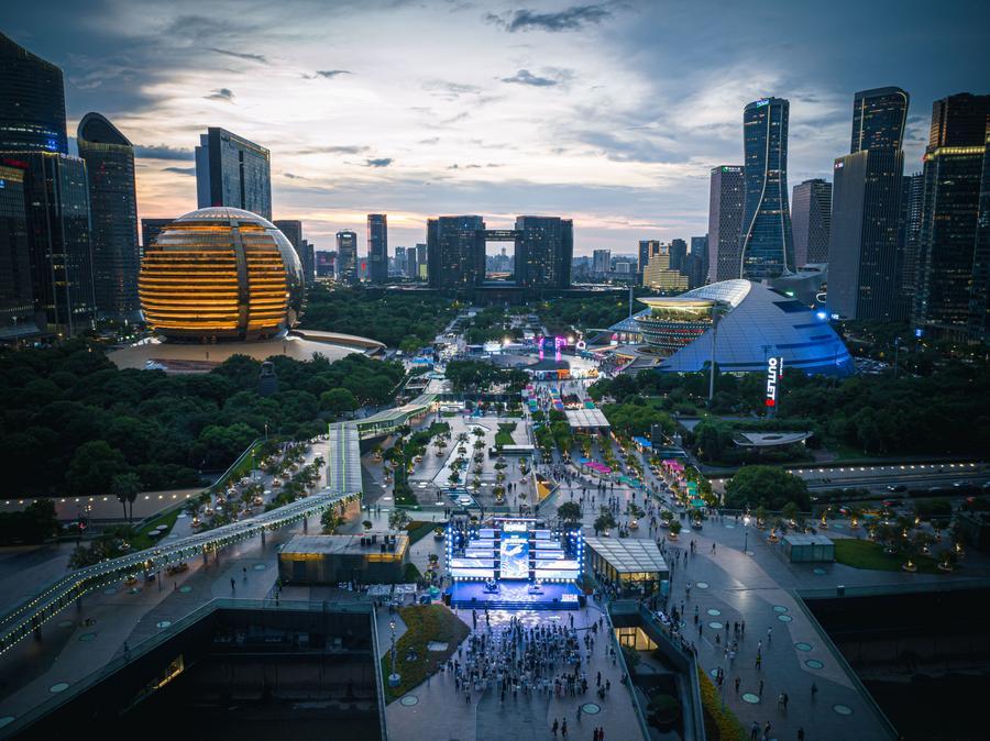 這是6月27日拍攝的位于杭州市上城區錢江新城的2025杭州奇妙夜活動主會場(無人機照片)。新華社記者 江漢 攝