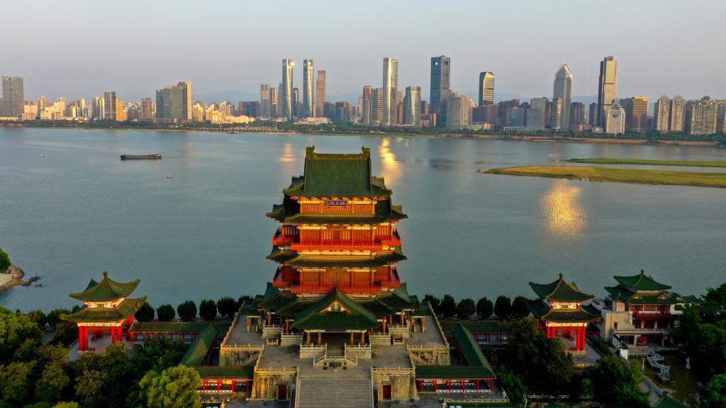晨光中的江西南昌滕王閣景區(7月7日攝,無人機照片)。新華社記者 劉金海 攝