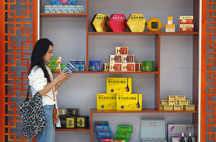 7月8日,游客在位于樟樹市的仁和集團展廳參觀中醫藥產品。新華社記者 萬象 攝
